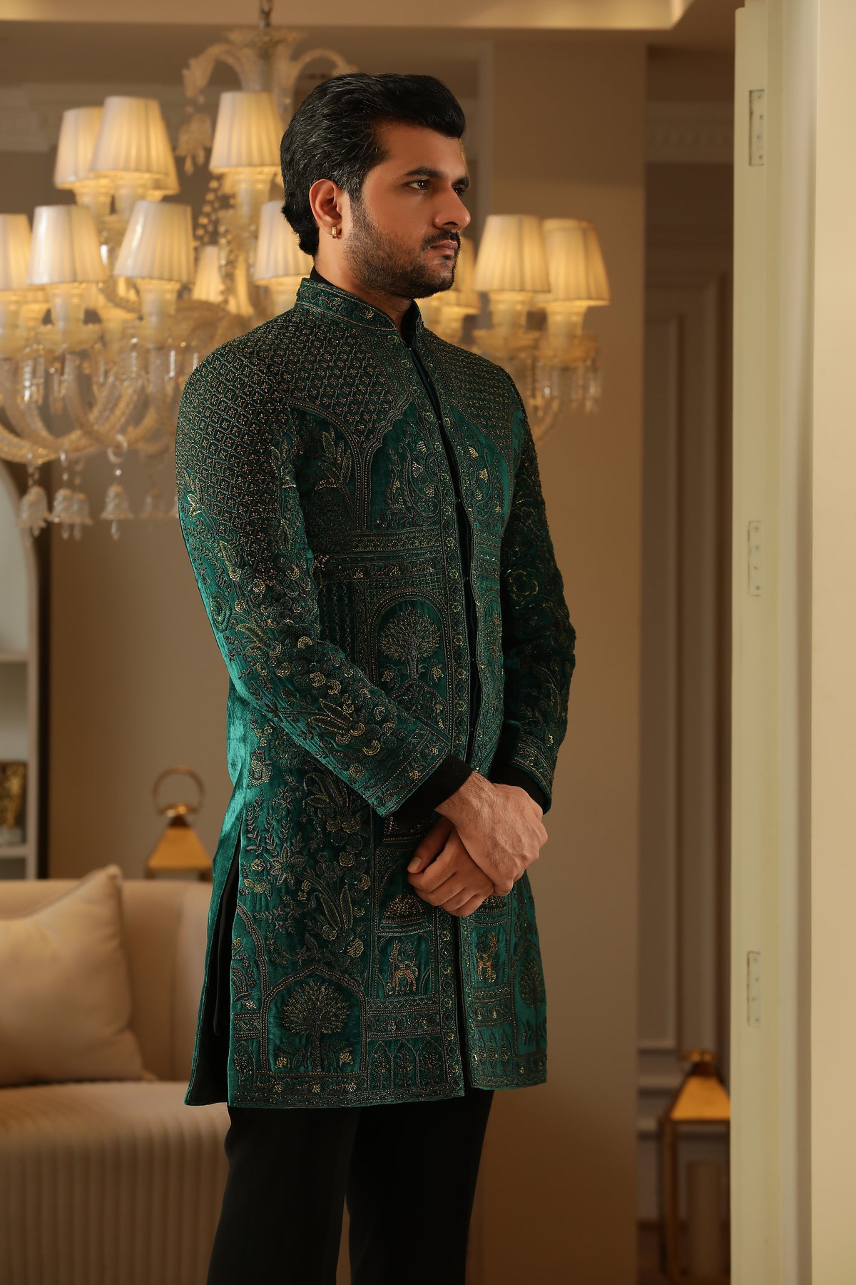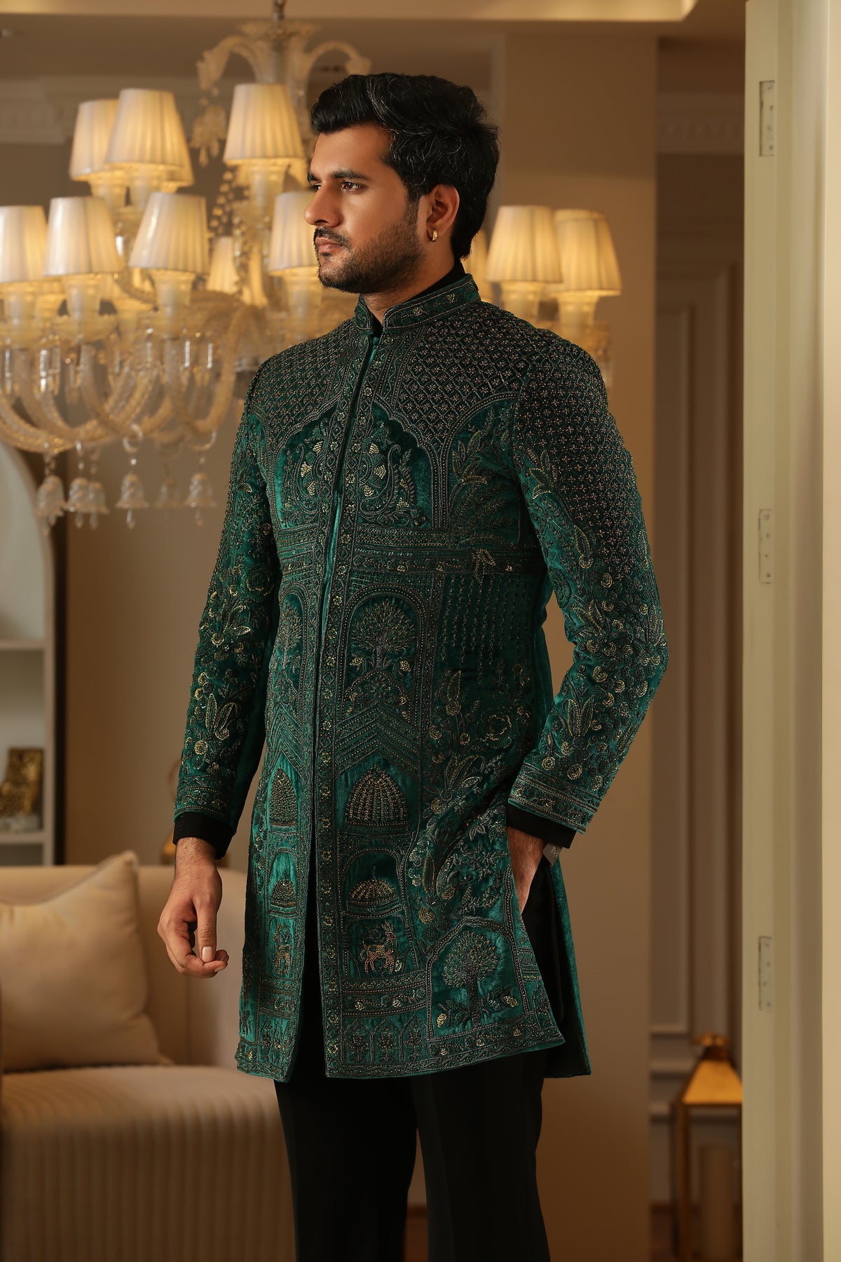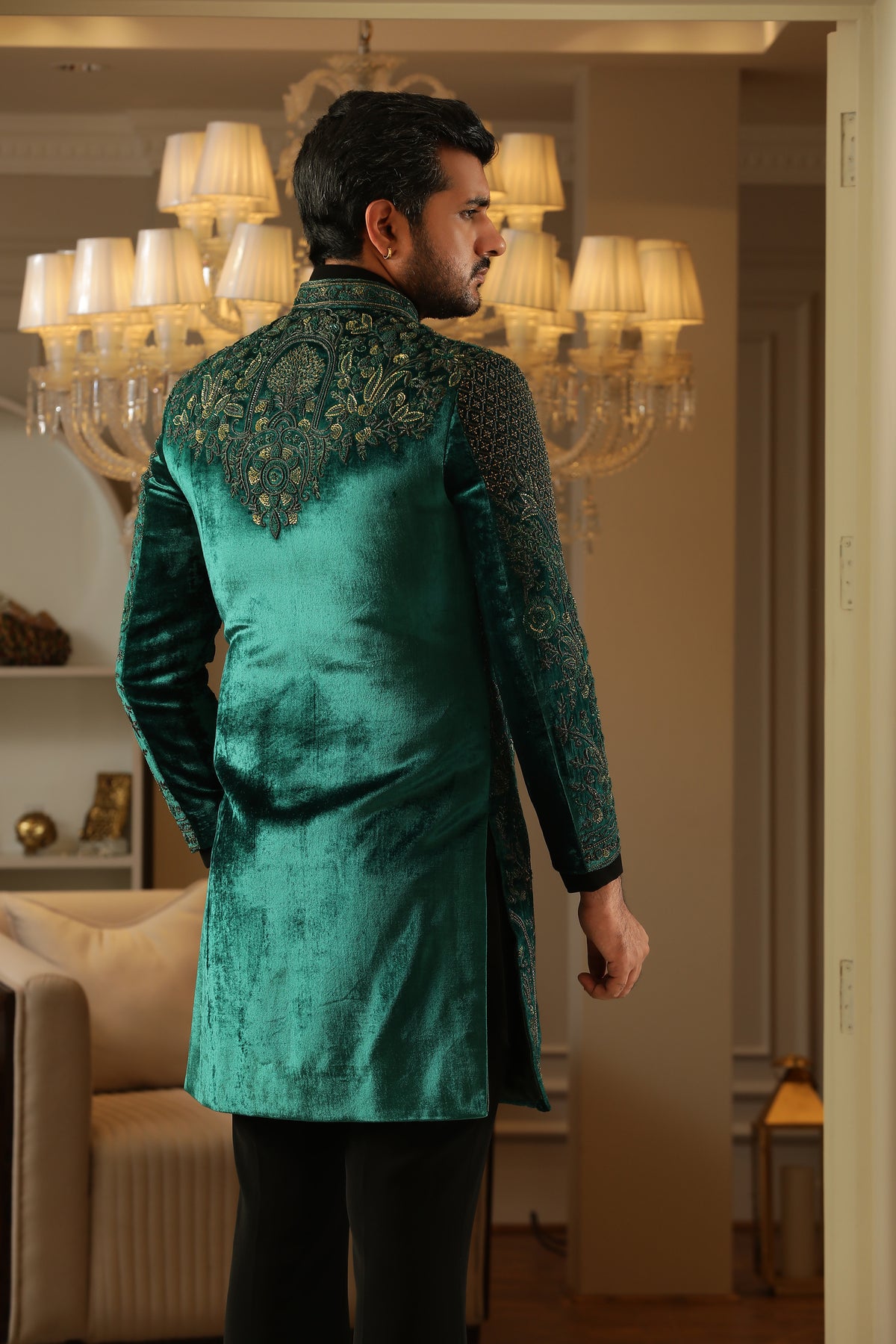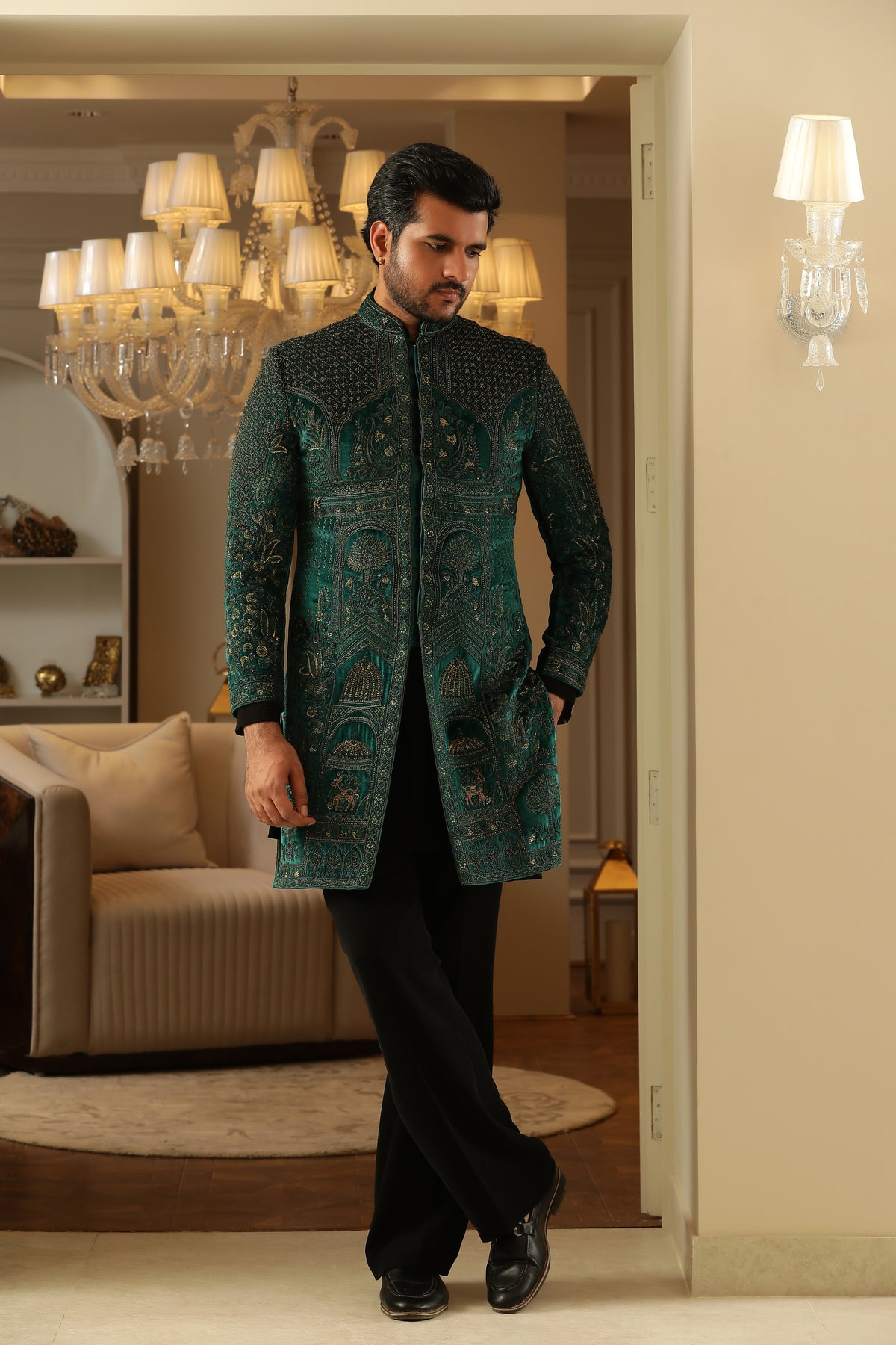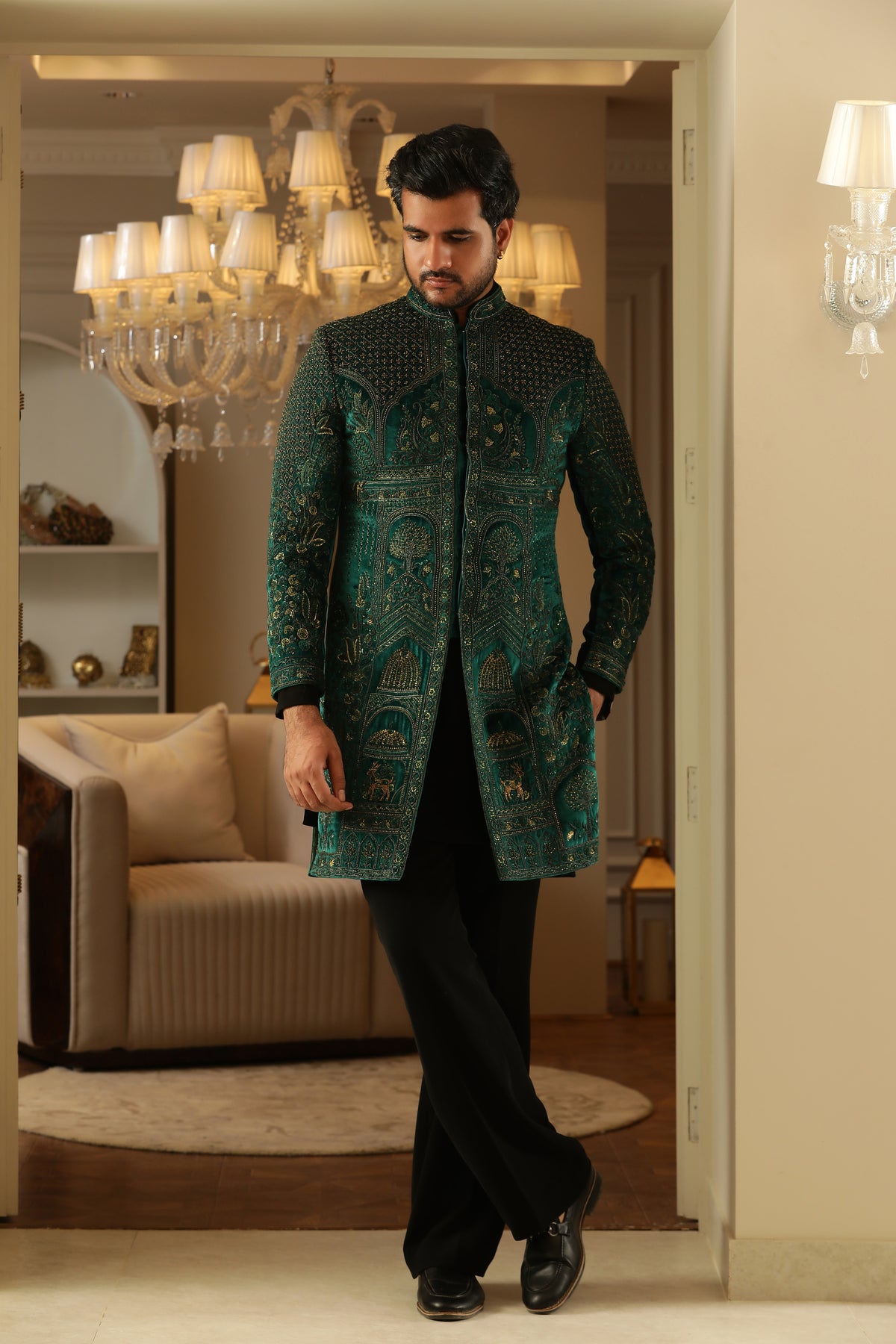 Discover refined fusion elegance in Copper Verdure — a sophisticated three‑piece indo‑western ensemble rendered in vibrant teal green, grounded by a sleek black shirt and trousers, and elevated with exquisite copper‑thread embroidery.