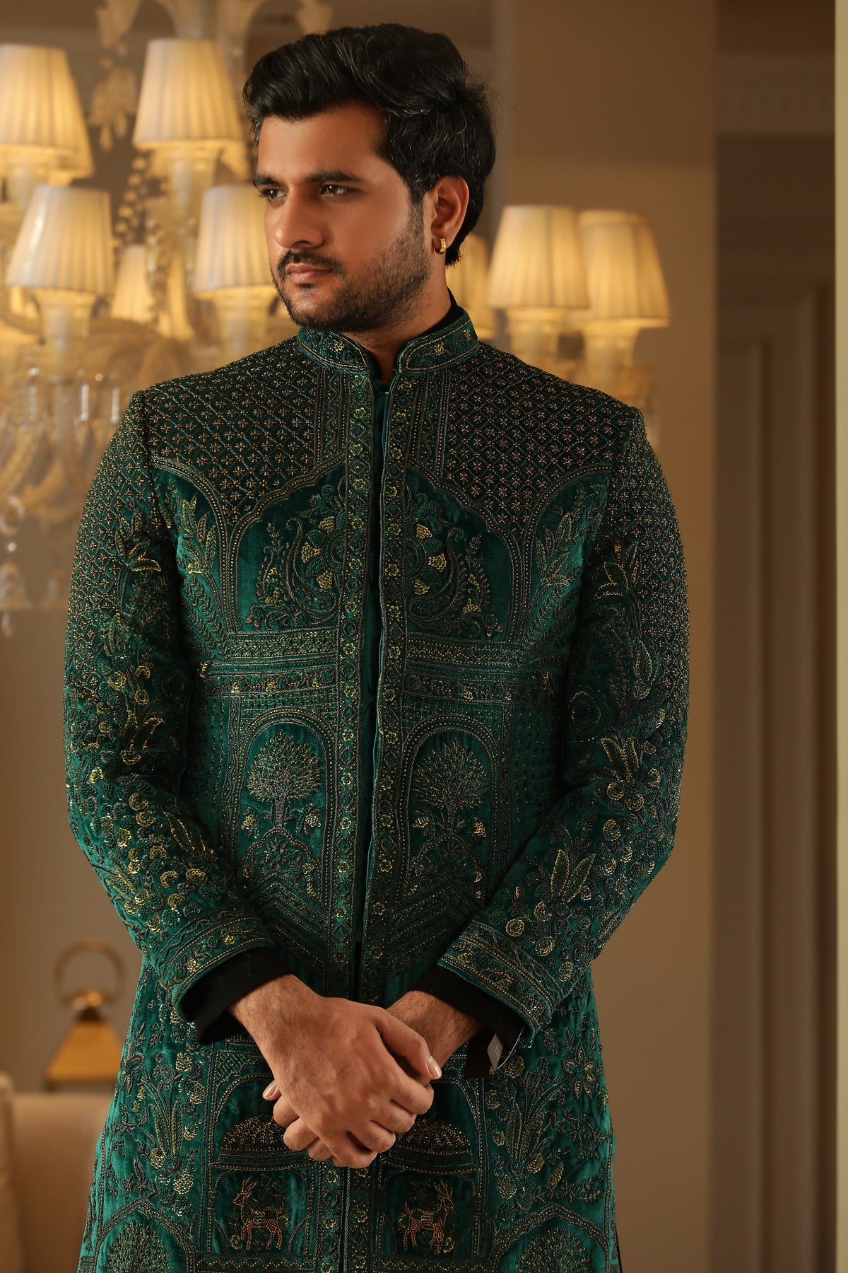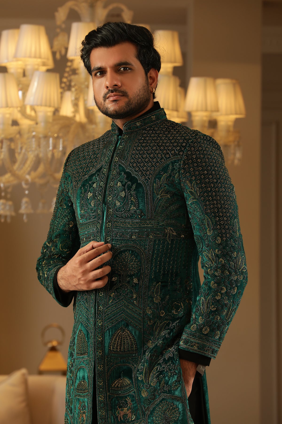 A jacket/overlay in teal green with copper embroidery for texture and visual richness.