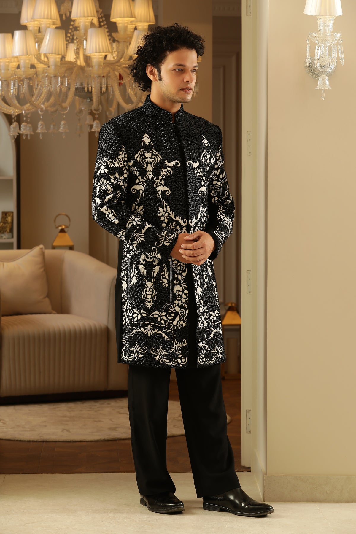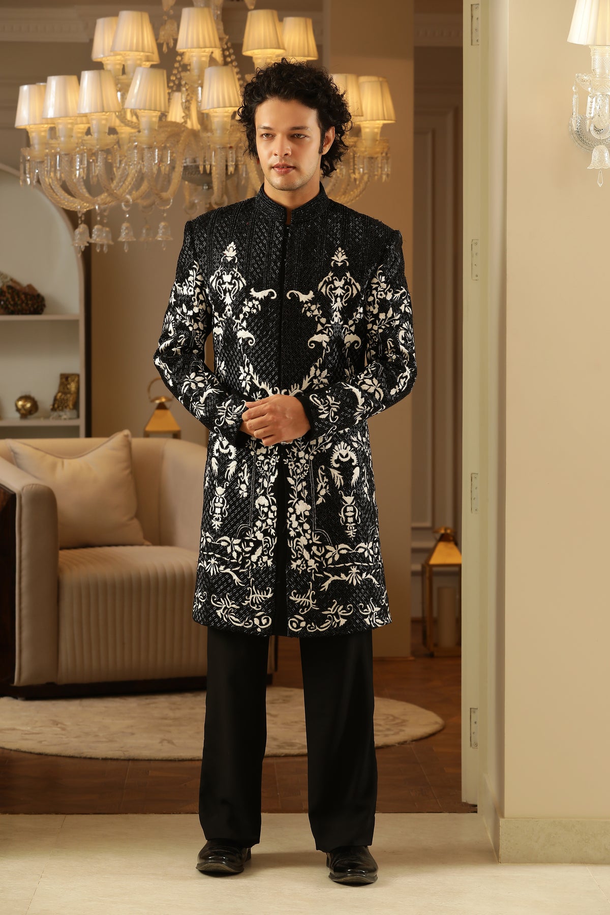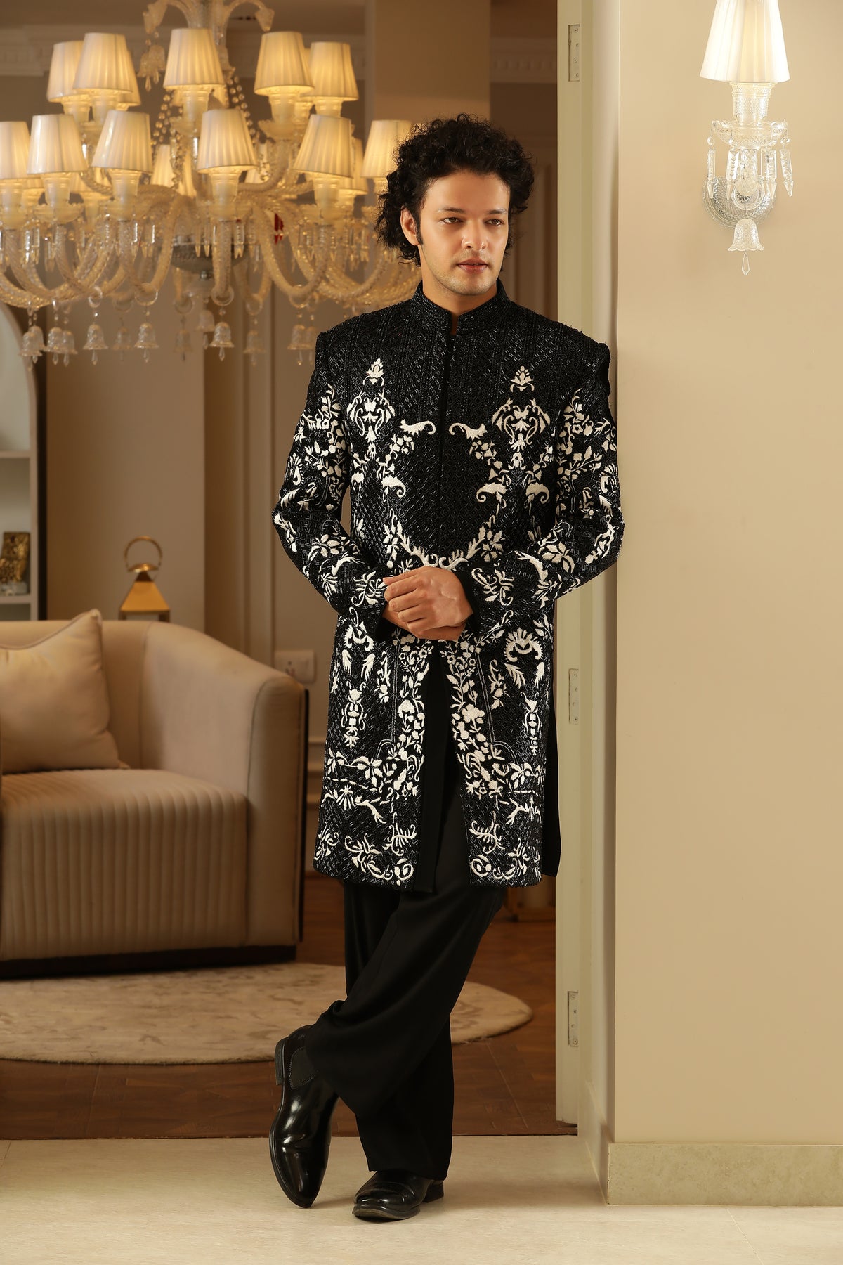 The black‑and‑white palette is timeless, striking and versatile — perfect for evening events, receptions or upscale fusion gatherings.