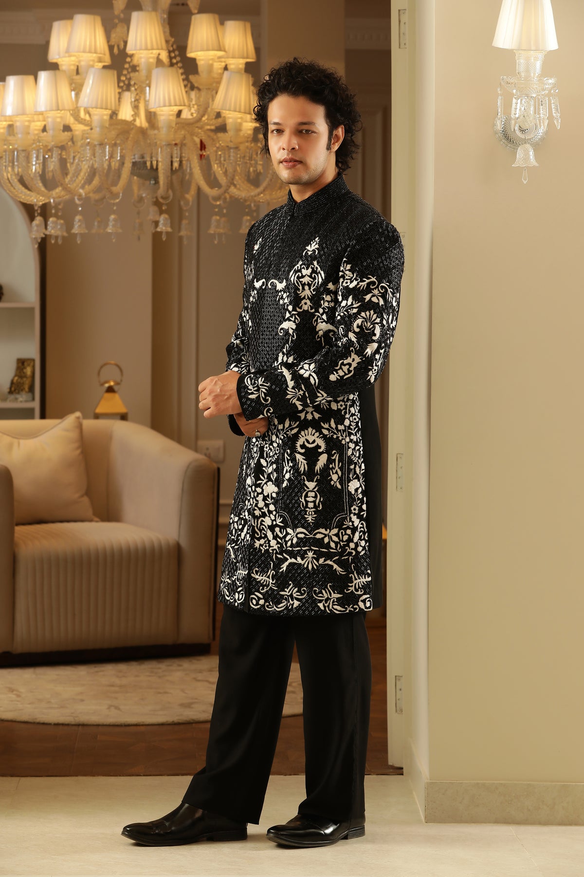 Trousers (Piece 3): Tailored trousers in black maintain visual balance and keep the lower half clean so the embellished upper layers stand out with clarity.