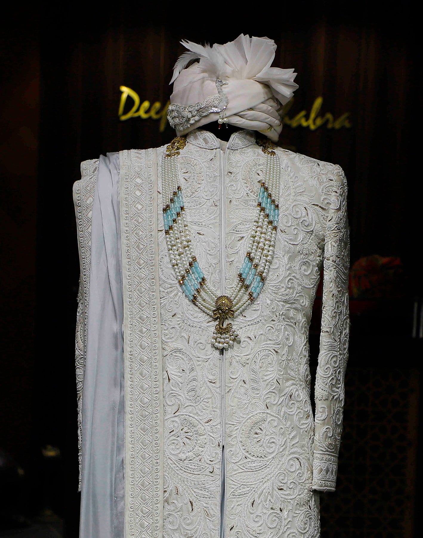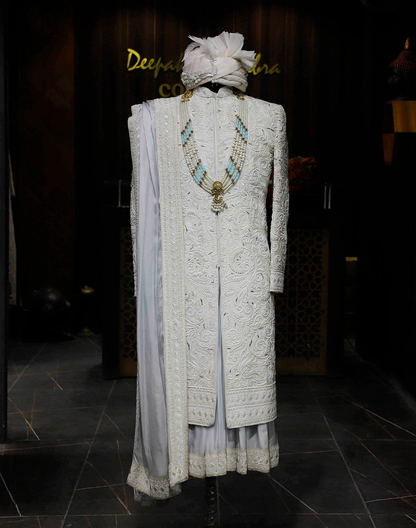 At Deepak S. Chhabra Couture, we believe in offering more than just clothing—we offer an experience. Our Off-White Sherwani with thread and pearl work is a masterpiece designed for the groom who values elegance, tradition, and individuality.