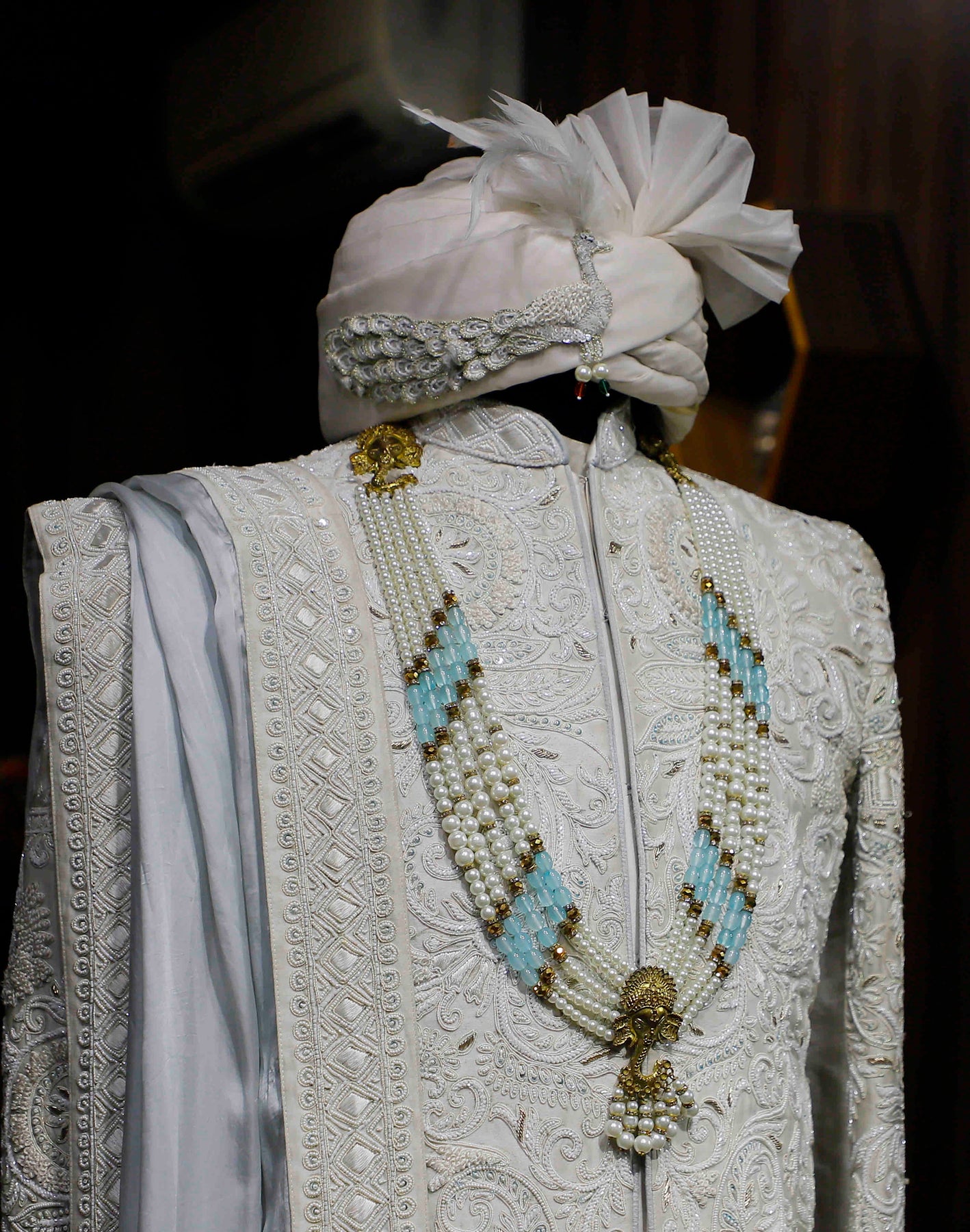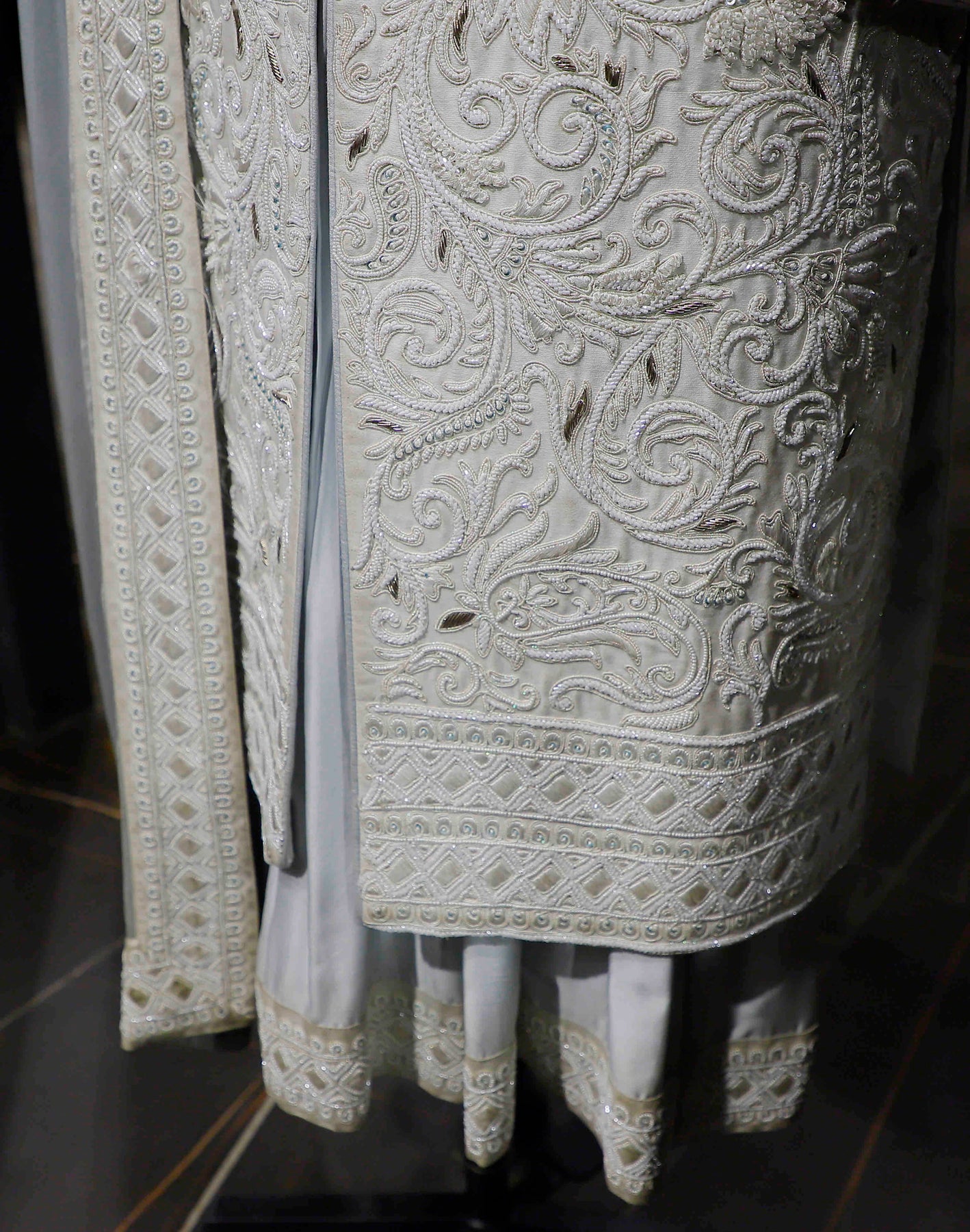 The all-over thread and pearl embroidery is a testament to the skill and dedication of our artisans. Each stitch and bead is carefully placed to create a mesmerizing pattern that dances across the sherwani, adding depth and dimension. The delicate pearls, intertwined with fine threads, bring a subtle yet striking contrast to the off-white canvas, making it a truly unique piece.