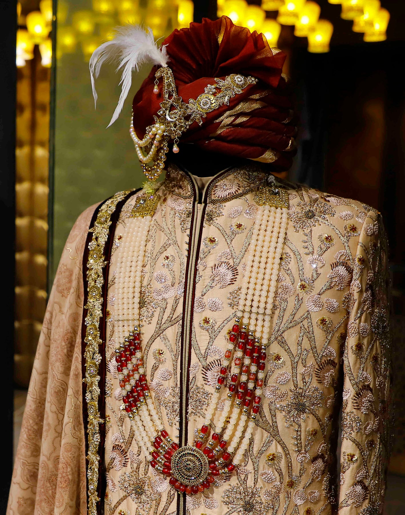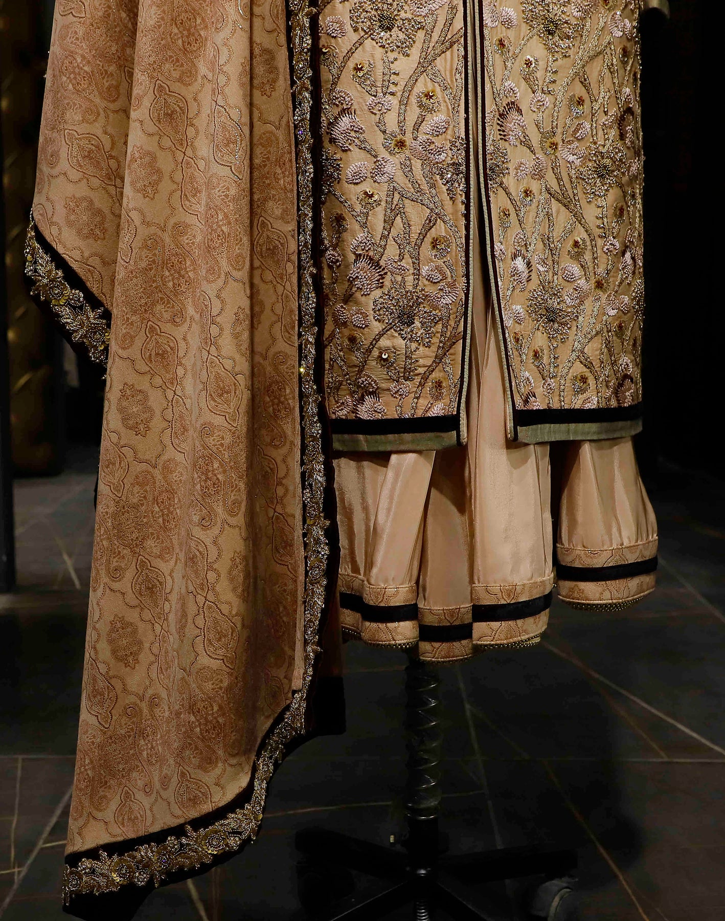 The sherwani’s golden hue is brought to life with exquisite multicolour detailing, meticulously crafted to create a harmonious blend of vibrant shades. Each element is designed to catch the light and the eye, making this sherwani an exceptional choice for those who wish to stand out.