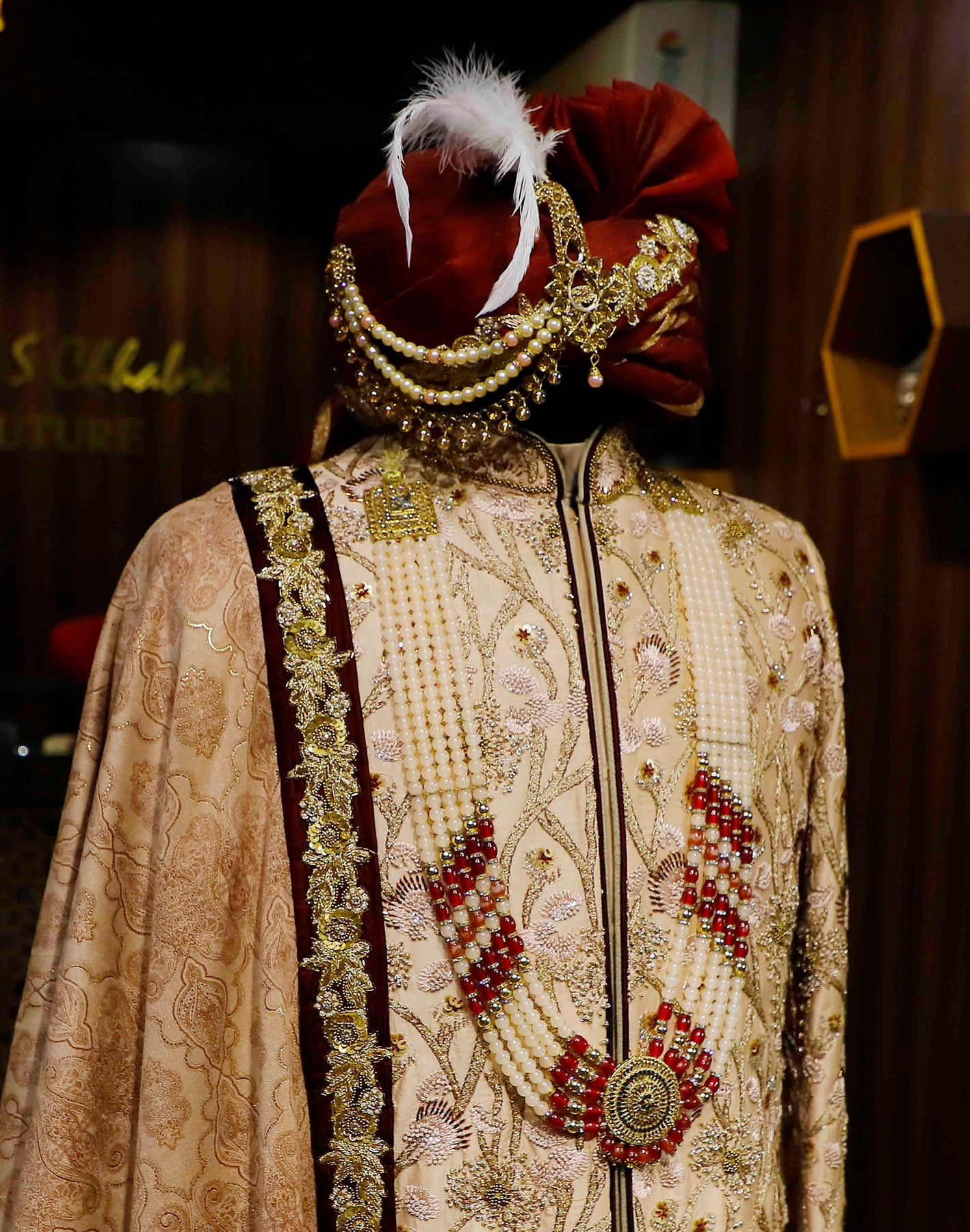 This Golden Sherwani with multicolour embellishments is a masterpiece that must be experienced in person. Visit our store or book an appointment online to explore this exclusive piece and discover the full Deepak S. Chhabra Couture collection.