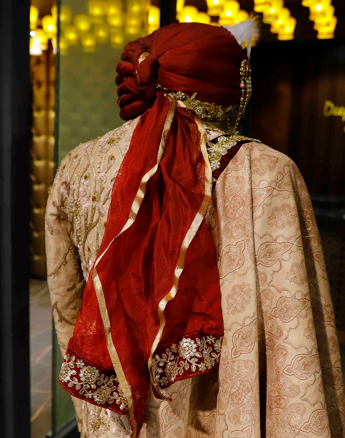 This sherwani is not just attire; it’s a statement. Perfect for the modern maharaja, it combines traditional craftsmanship with contemporary style, ensuring that you look and feel like royalty on your special day.