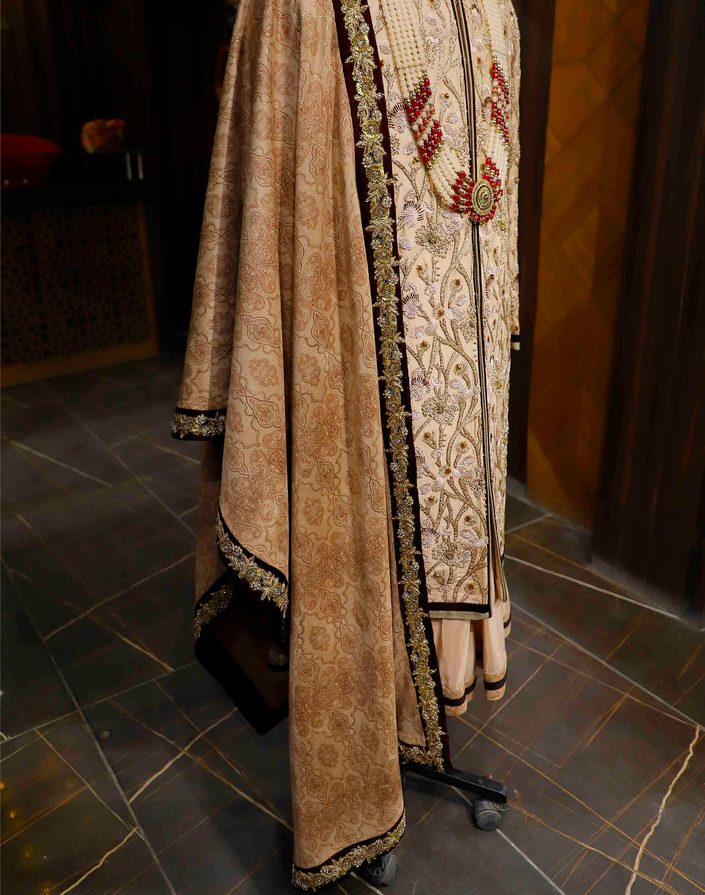 Adding to its allure, this sherwani features self-printed velvet stones, offering a unique texture that contrasts beautifully with the rich golden fabric. The velvet stones are intricately placed, adding depth and dimension to the ensemble, making it both luxurious and refined.