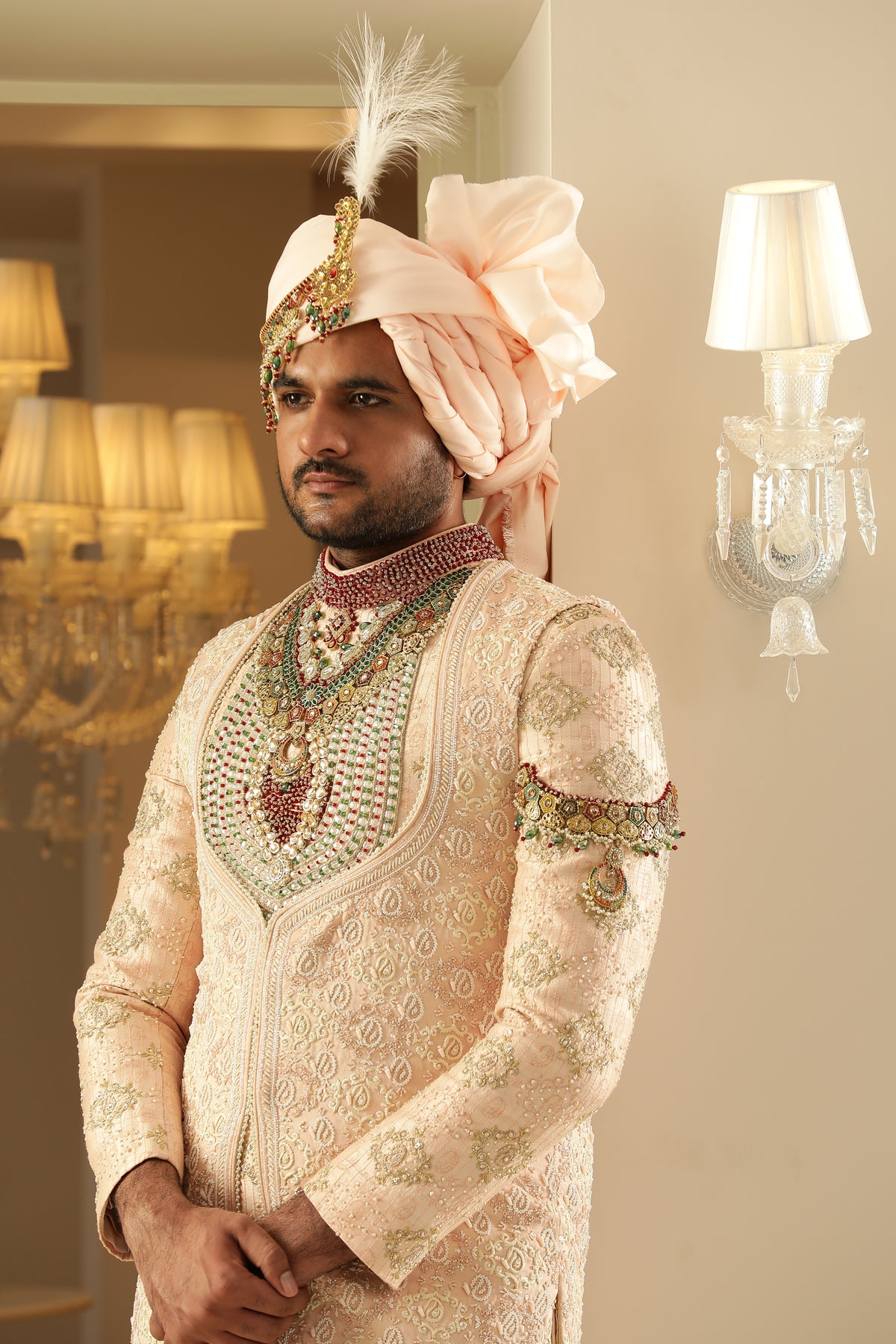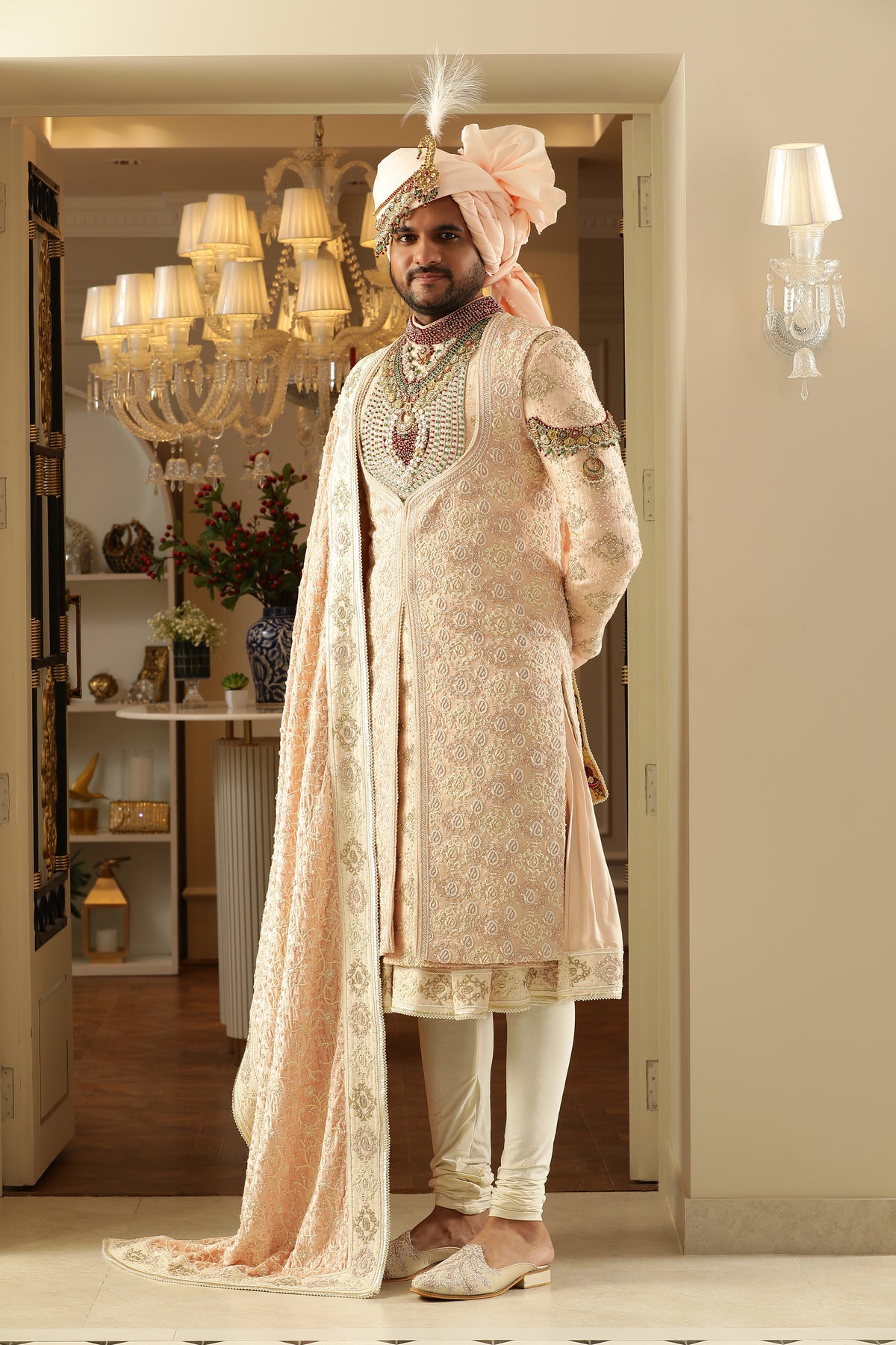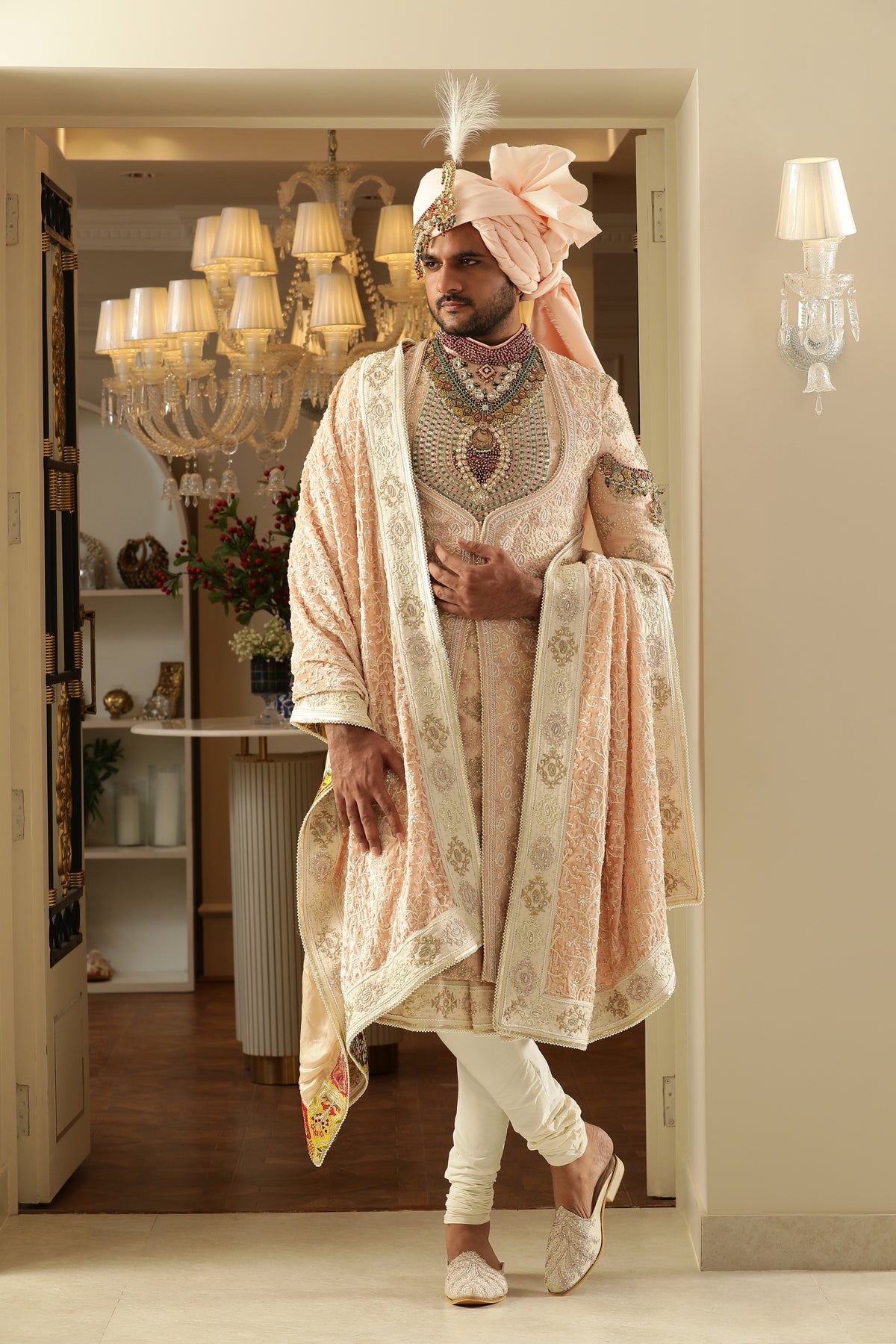 An ode to understated grandeur, the 3-layered nude peach sherwani embodies refined sophistication and poetic charm. Crafted for the modern royal, each layer flows gracefully to create depth, dimension, and a gentle aura of regality.