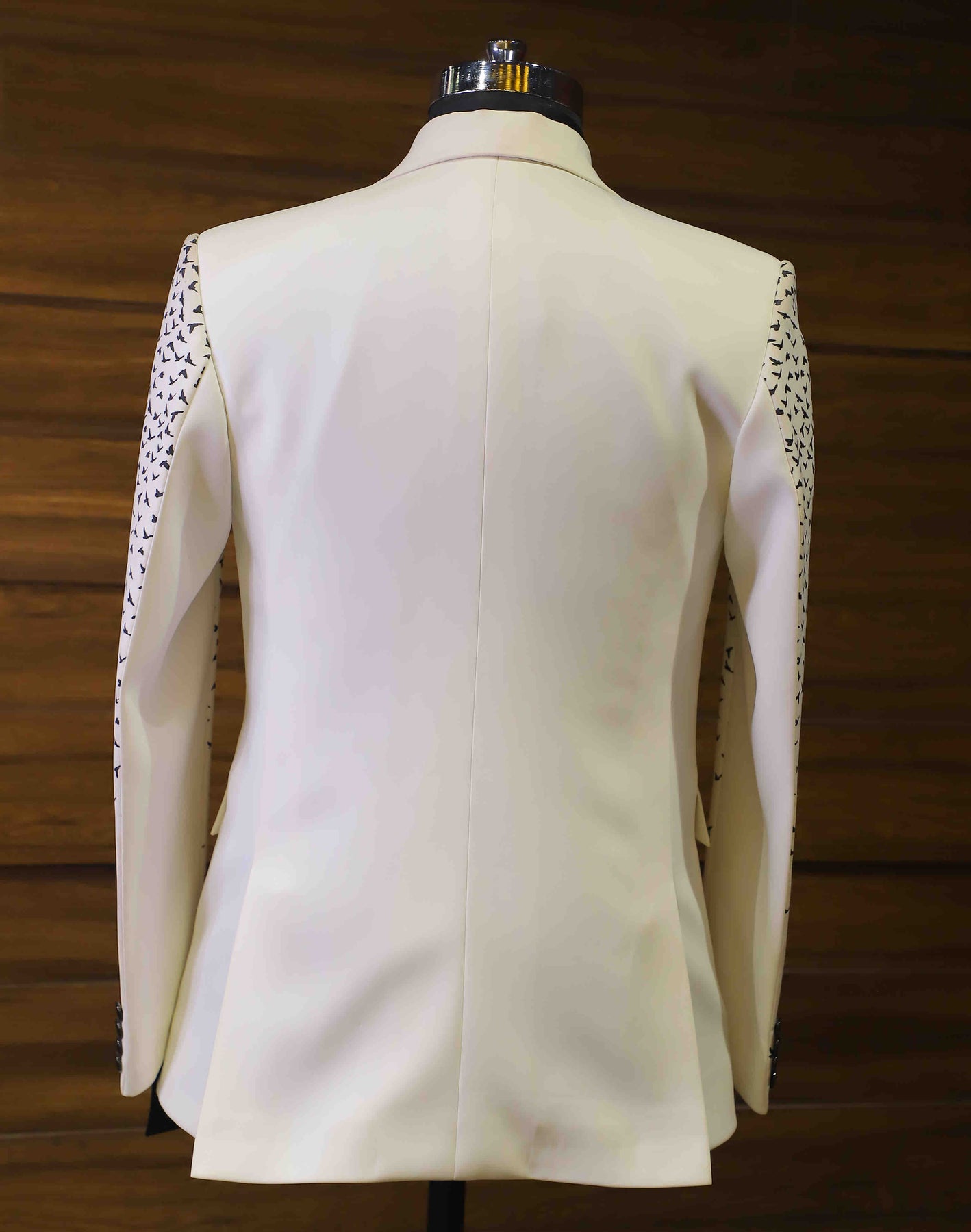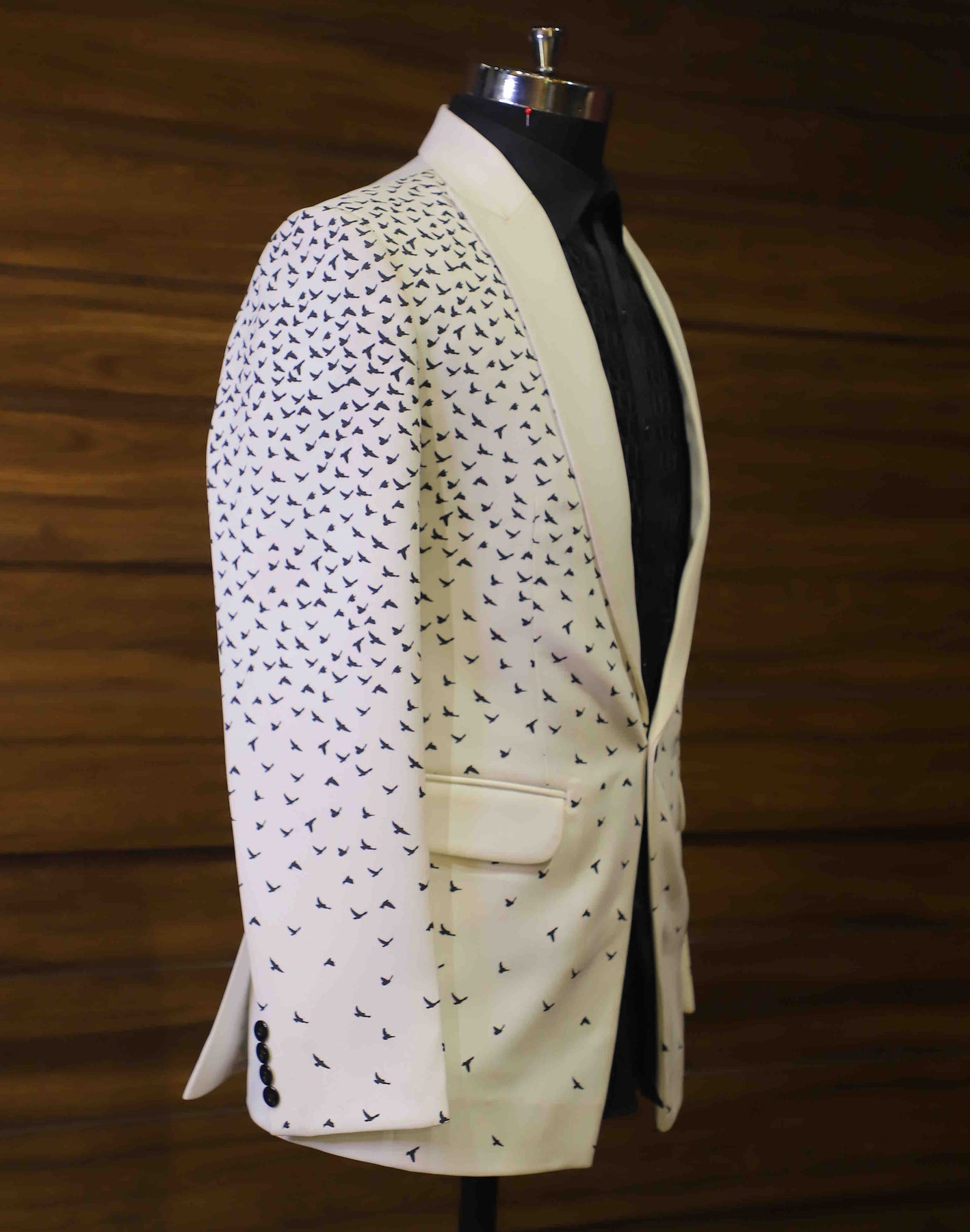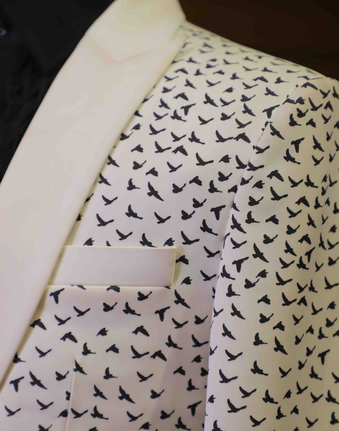Each piece of this tuxedo set is adorned with delicately hand-painted birds, showcasing an array of sizes and intricate details. This bespoke artistry turns the traditional tuxedo into a unique fashion statement, blending traditional elegance with creative flair.
