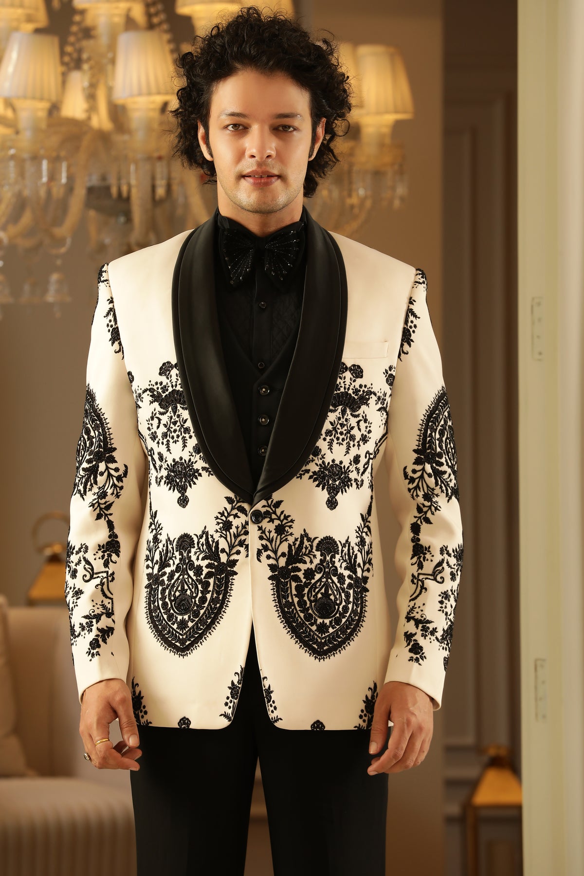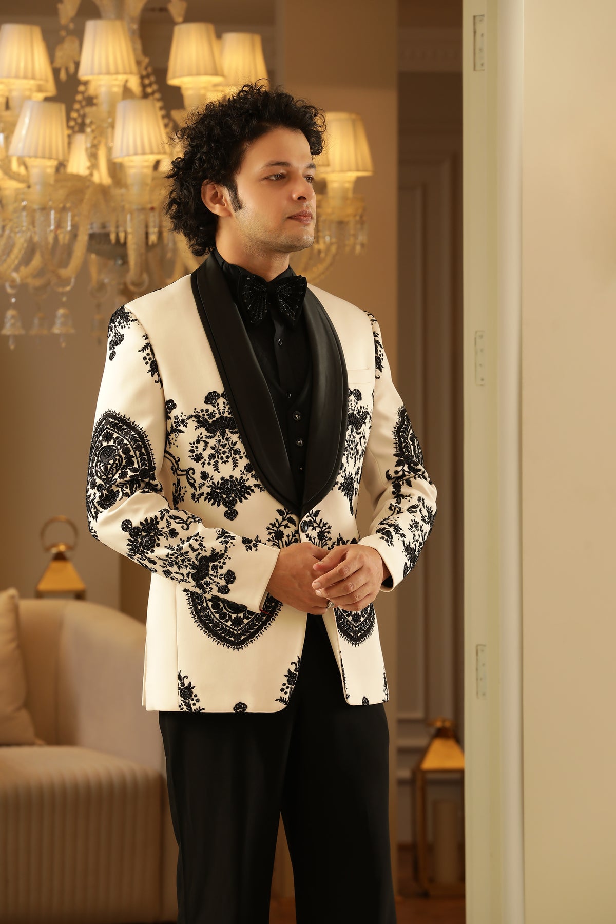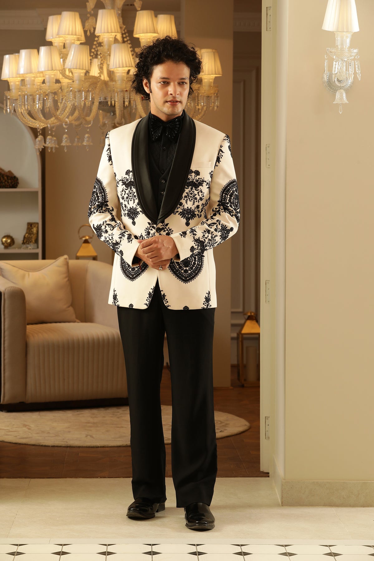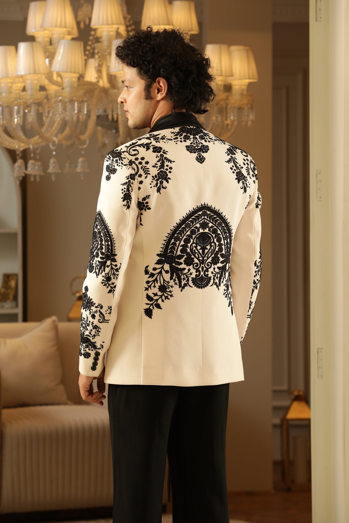 Tux Jacket: The pièce de résistance — crafted in off‑white (ivory/cream) fabric with striking black patch‑work and all‑over hand‑embroidery, the jacket commands attention while exuding refined elegance.