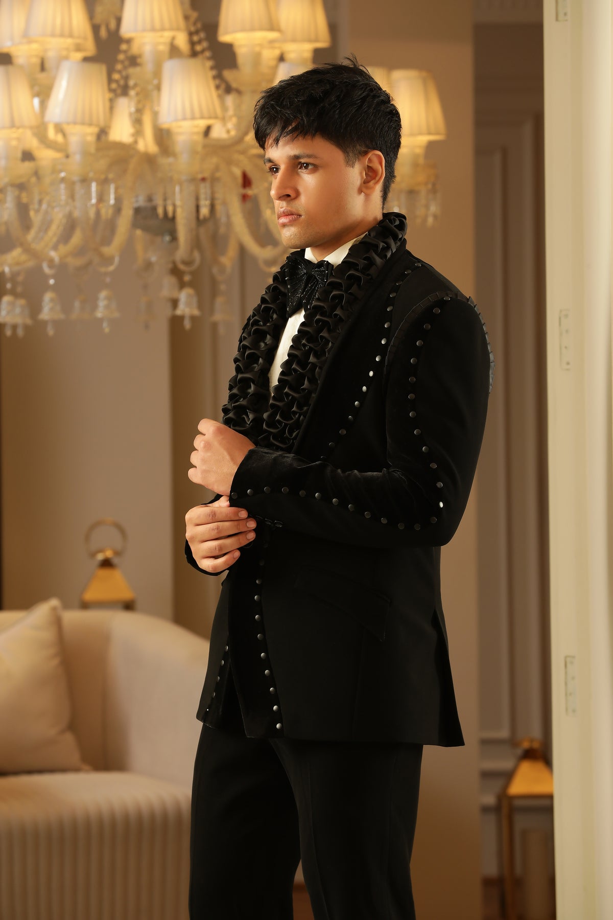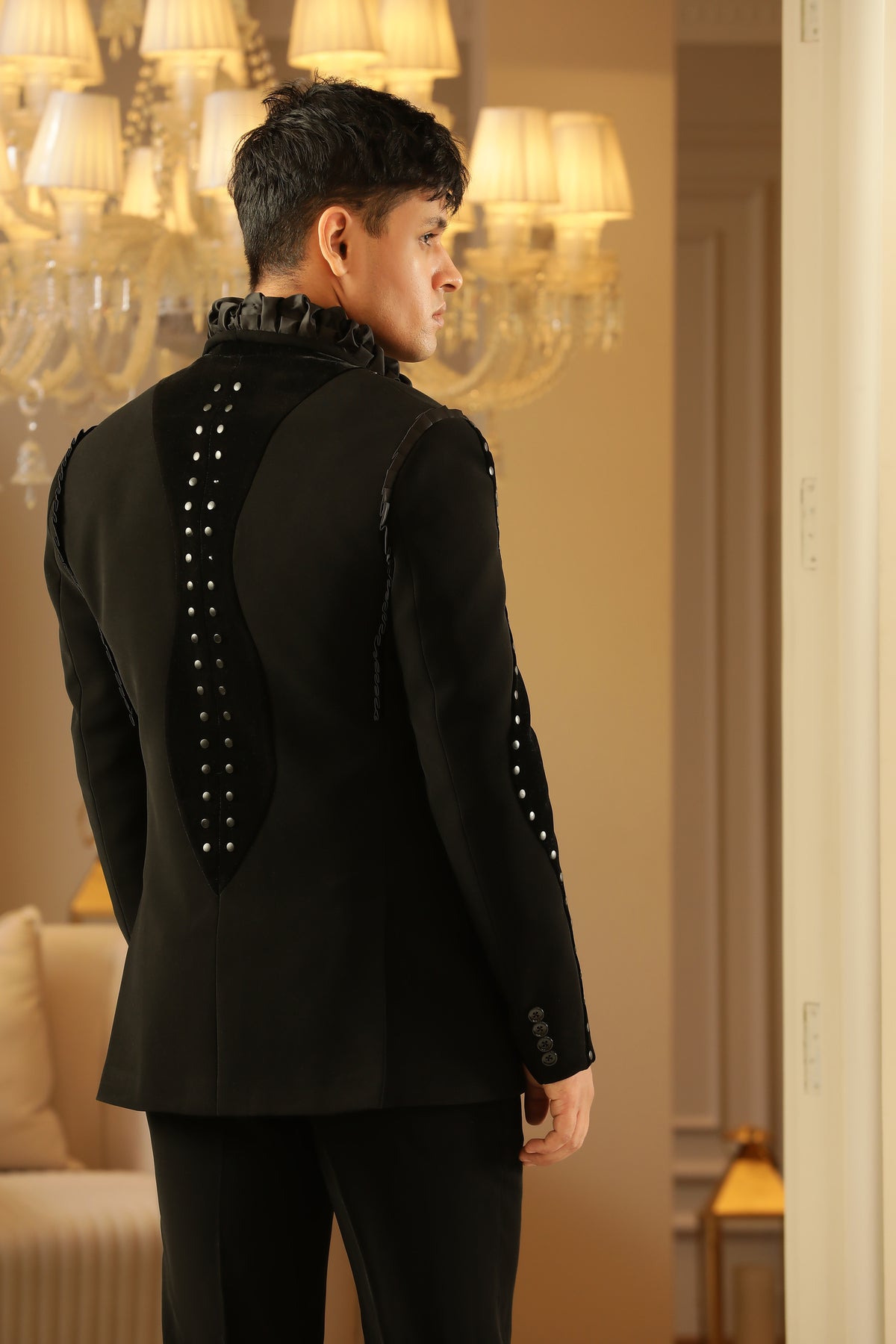 Waistcoat: Matching black waistcoat with subtle velvet accents, providing a sleek, layered silhouette.