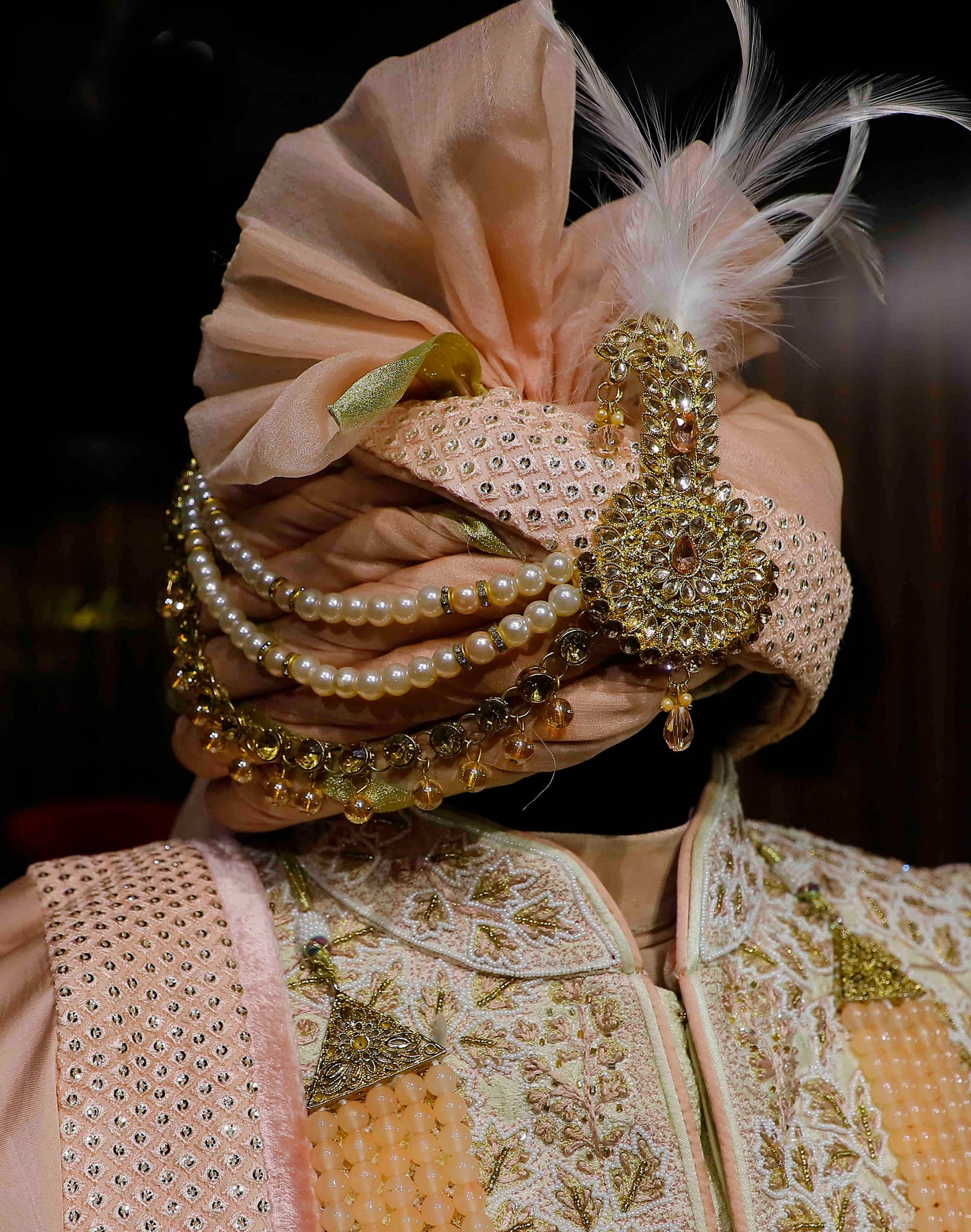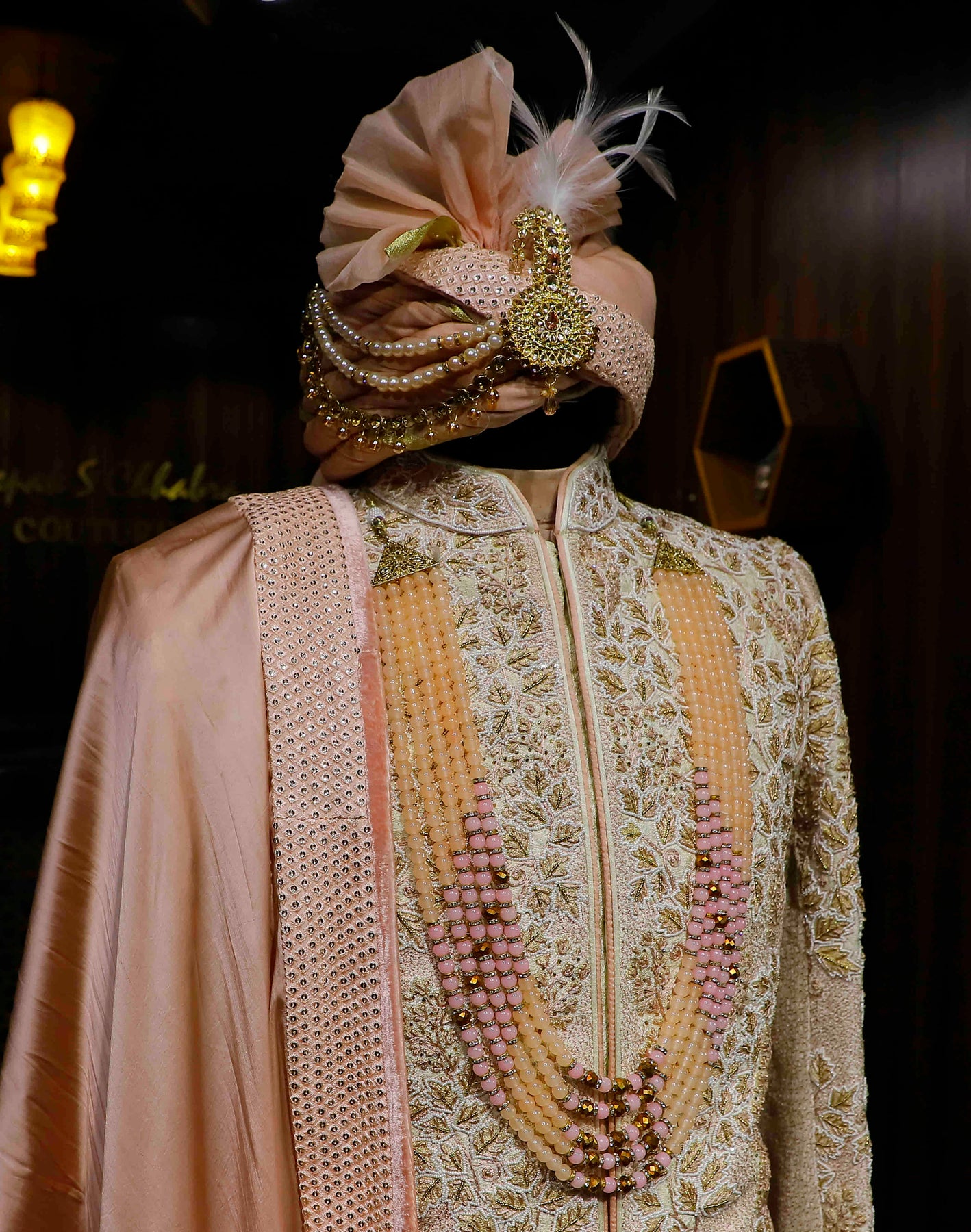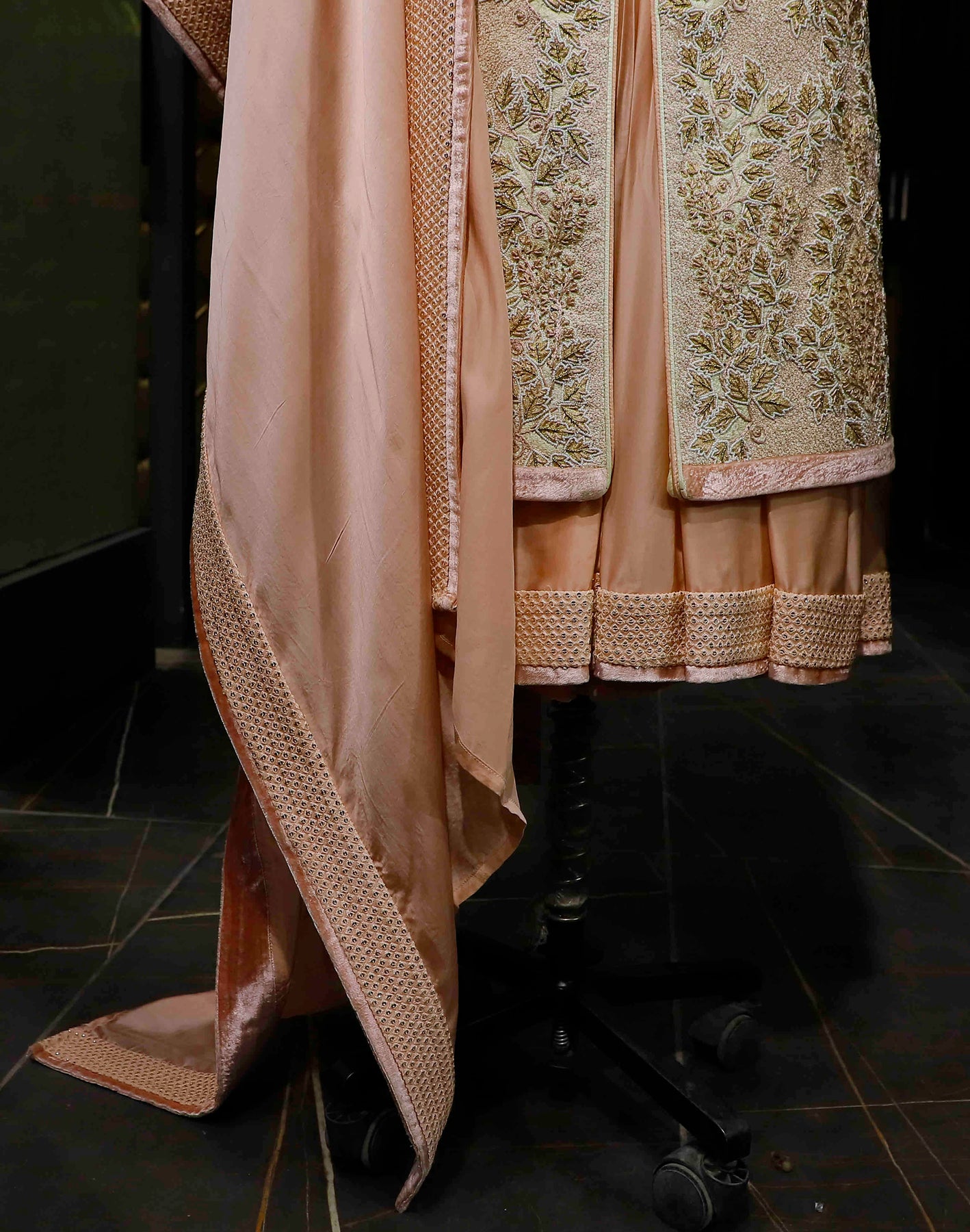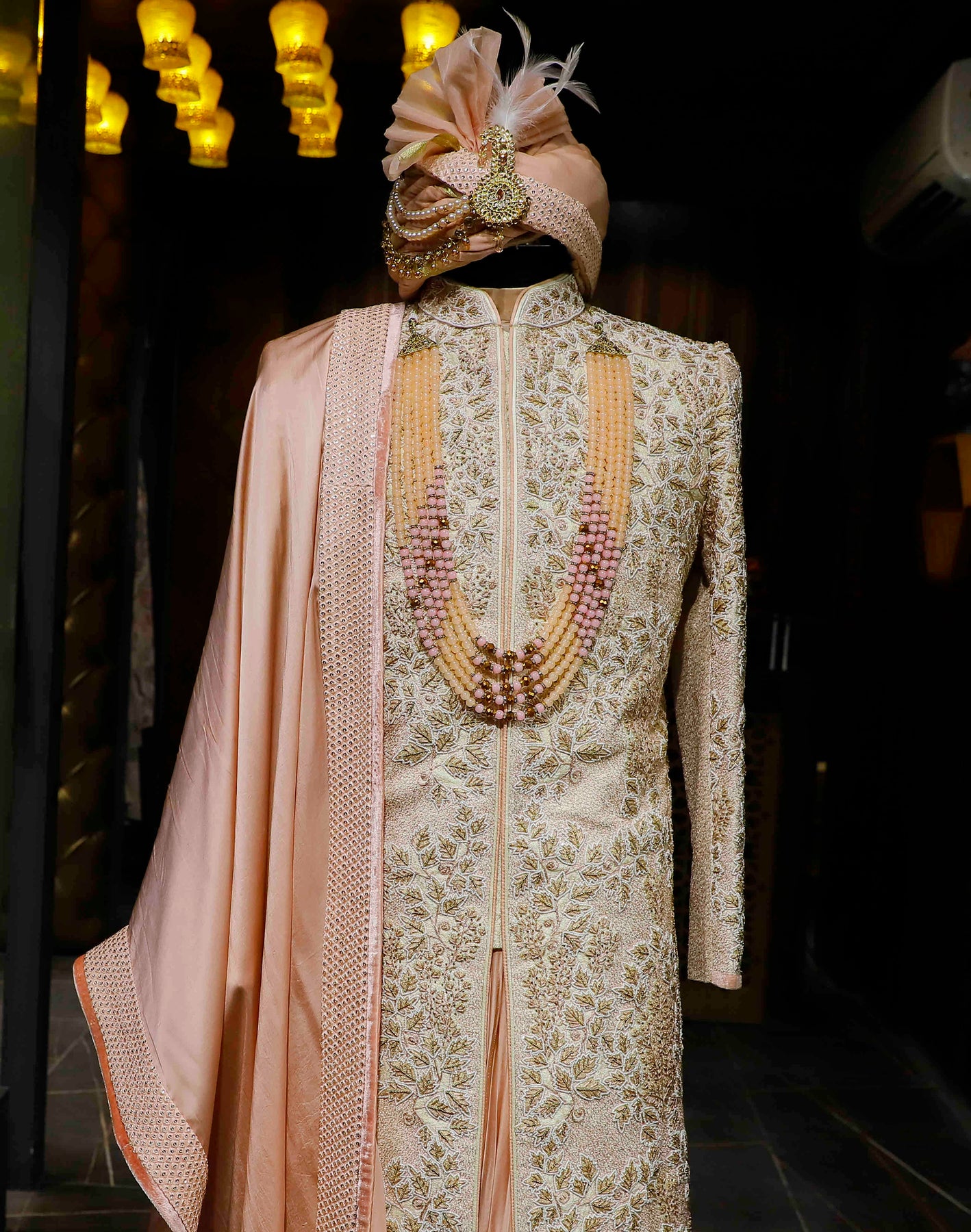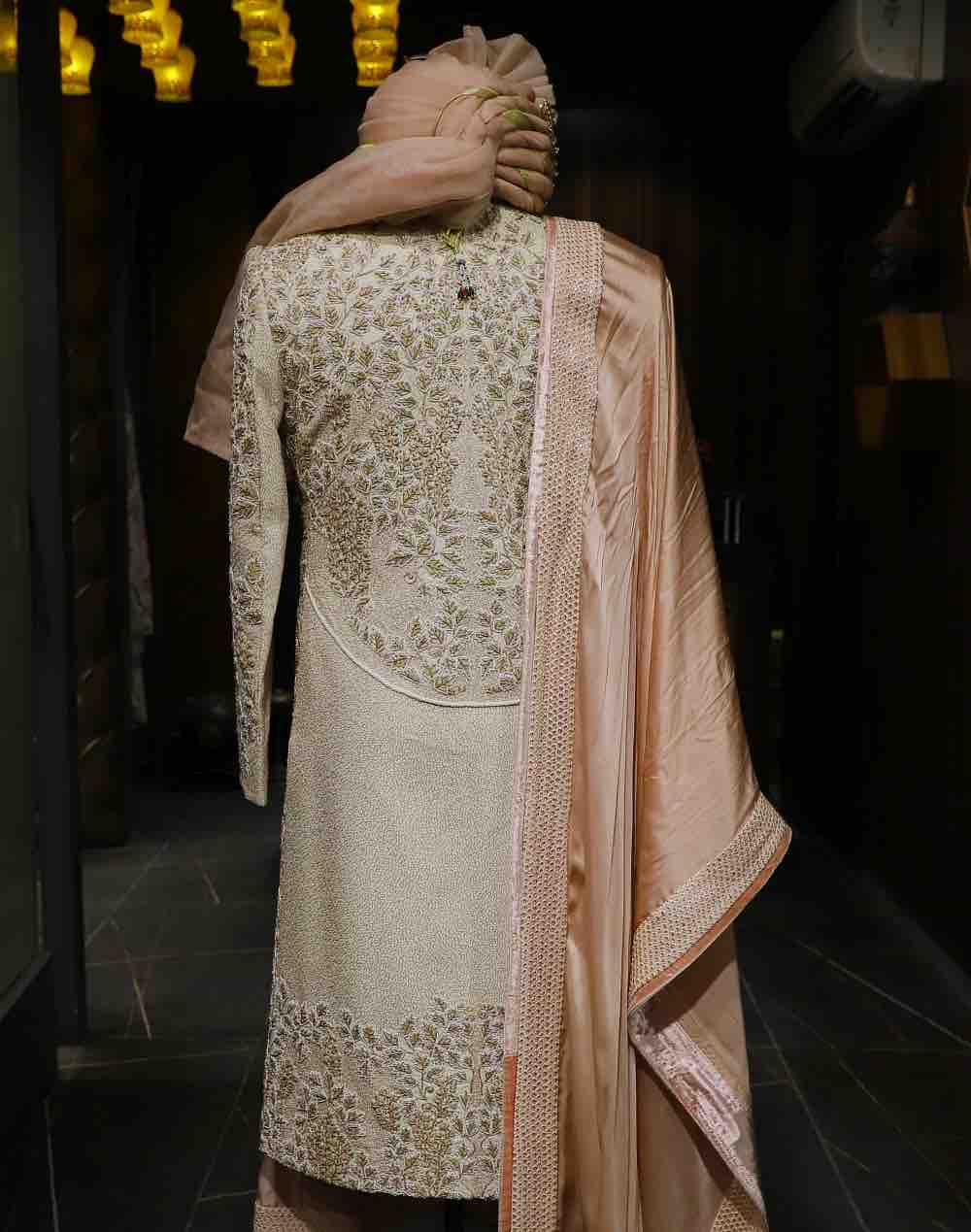 Peach perfection on cream dreams. Unveiling the exquisite Sherwani that's all about the details. Threads of tradition, shades of elegance, this light cream Sherwani with peach details is a fashion statement.