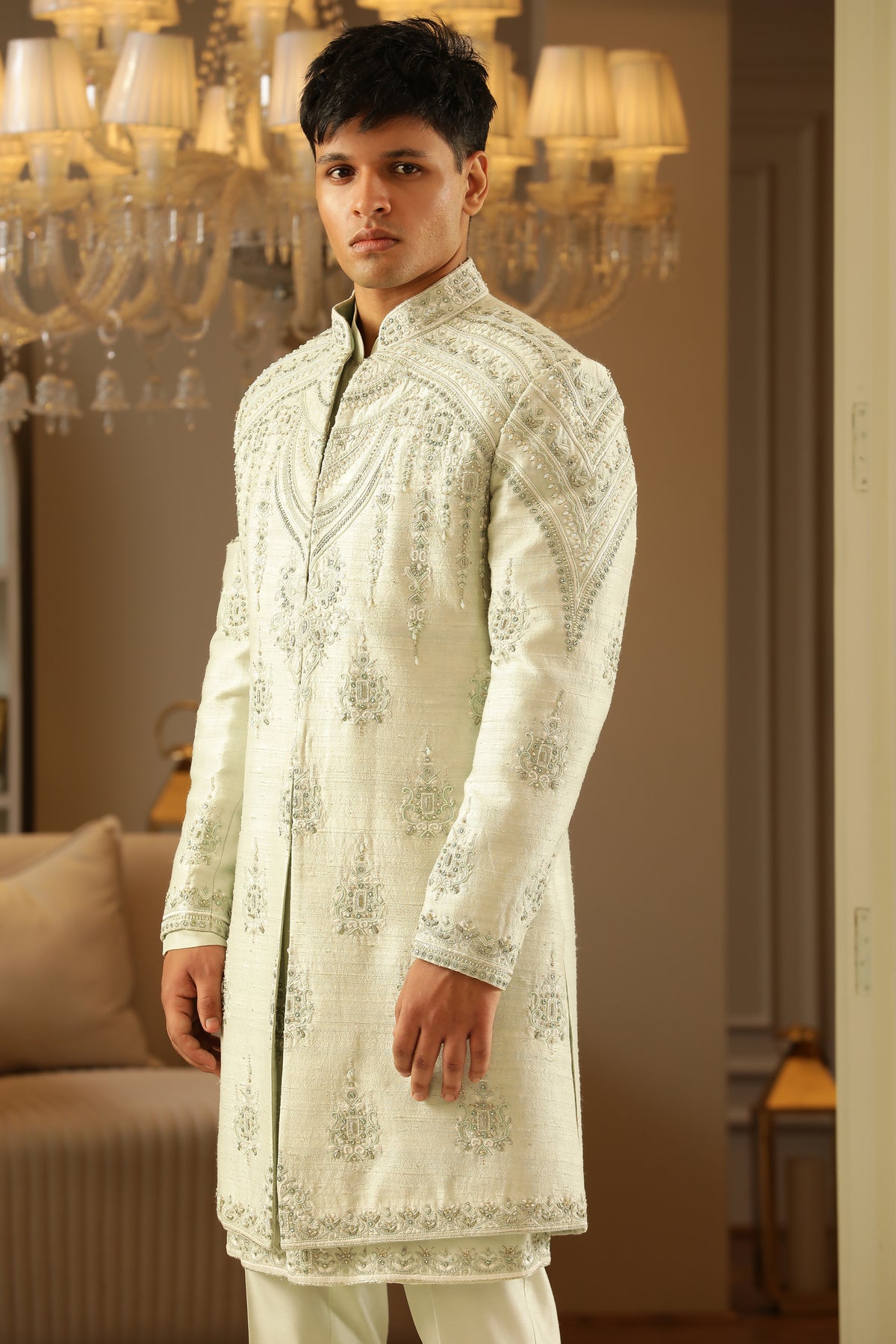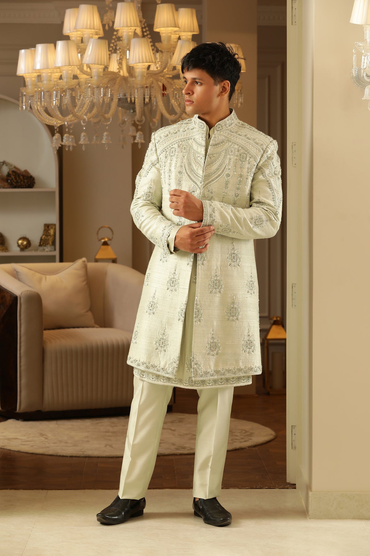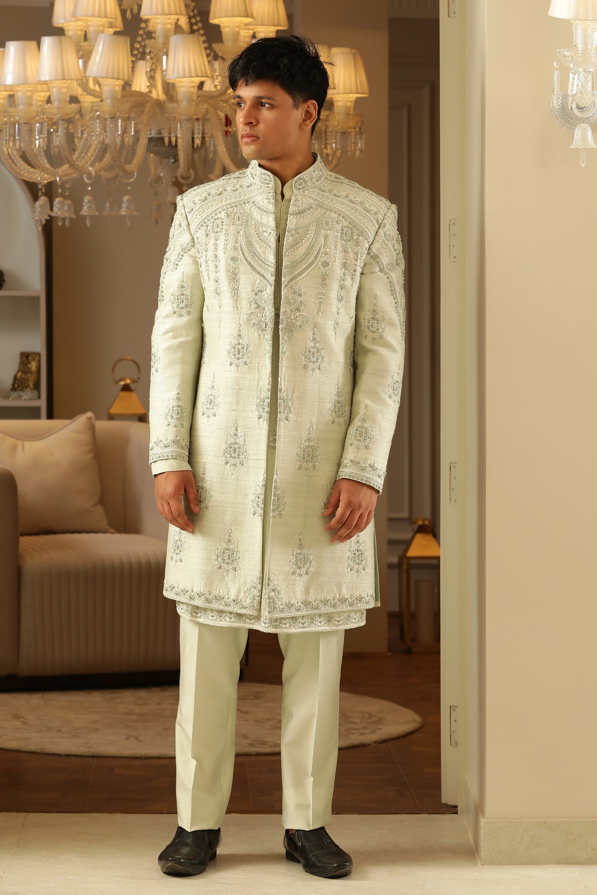 The hand‑embroidery brings artisan craftsmanship to the forefront, while the fusion of traditional elements (kurta + embroidery) with modern layers (jacket) makes this a versatile outfit for festive evenings, day celebrations or upscale receptions. The sage green base offers a calm, elegant palette that pairs beautifully with metallic accessories or muted jewellery.
