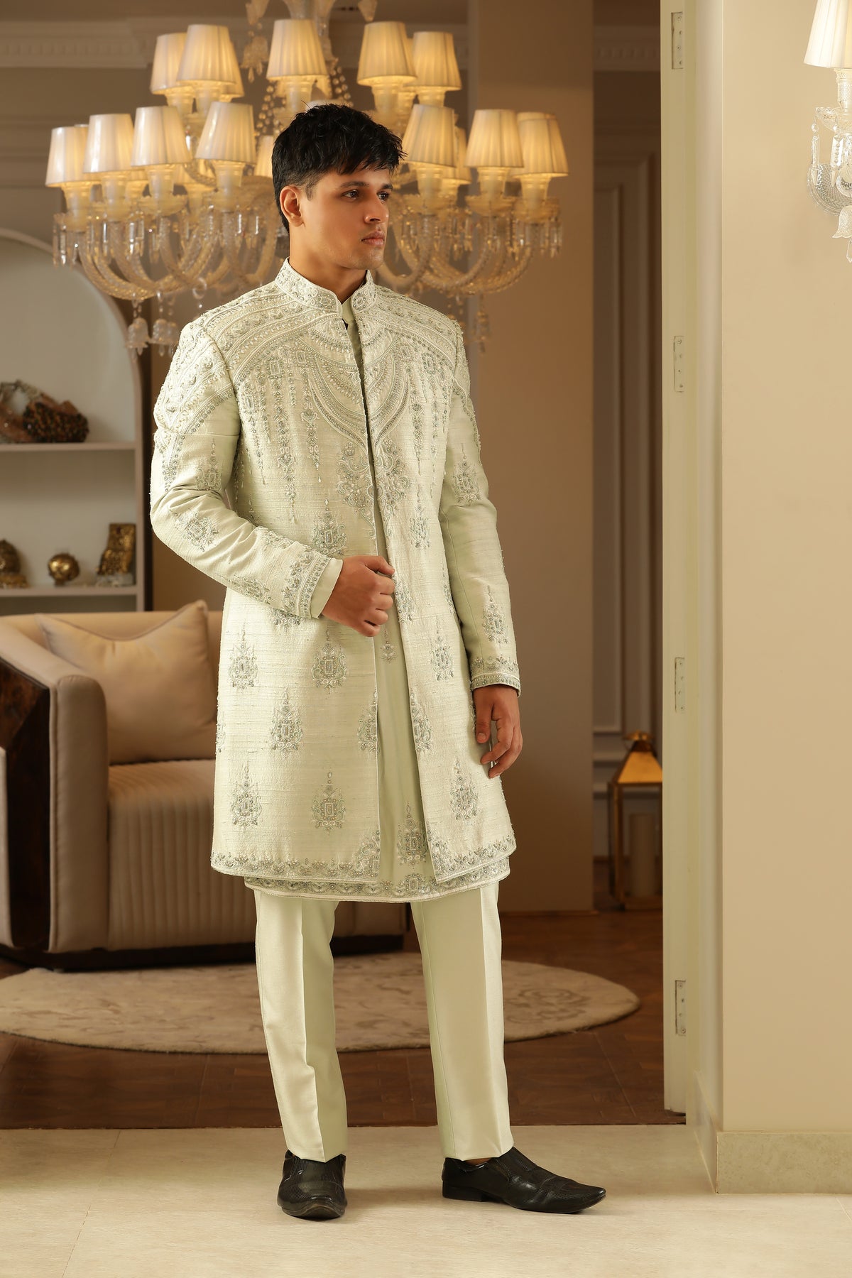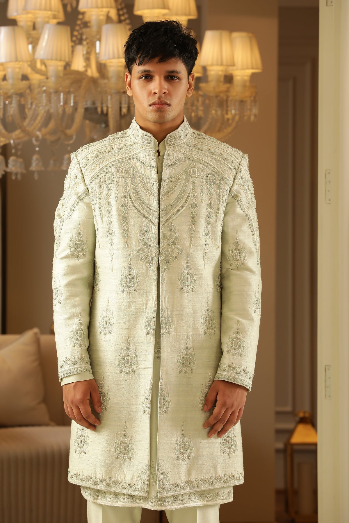 Kurta: Classic yet contemporary, the kurta features rich hand‑embroidered accents on the neckline, sleeves and hem, creating refined texture and movement.